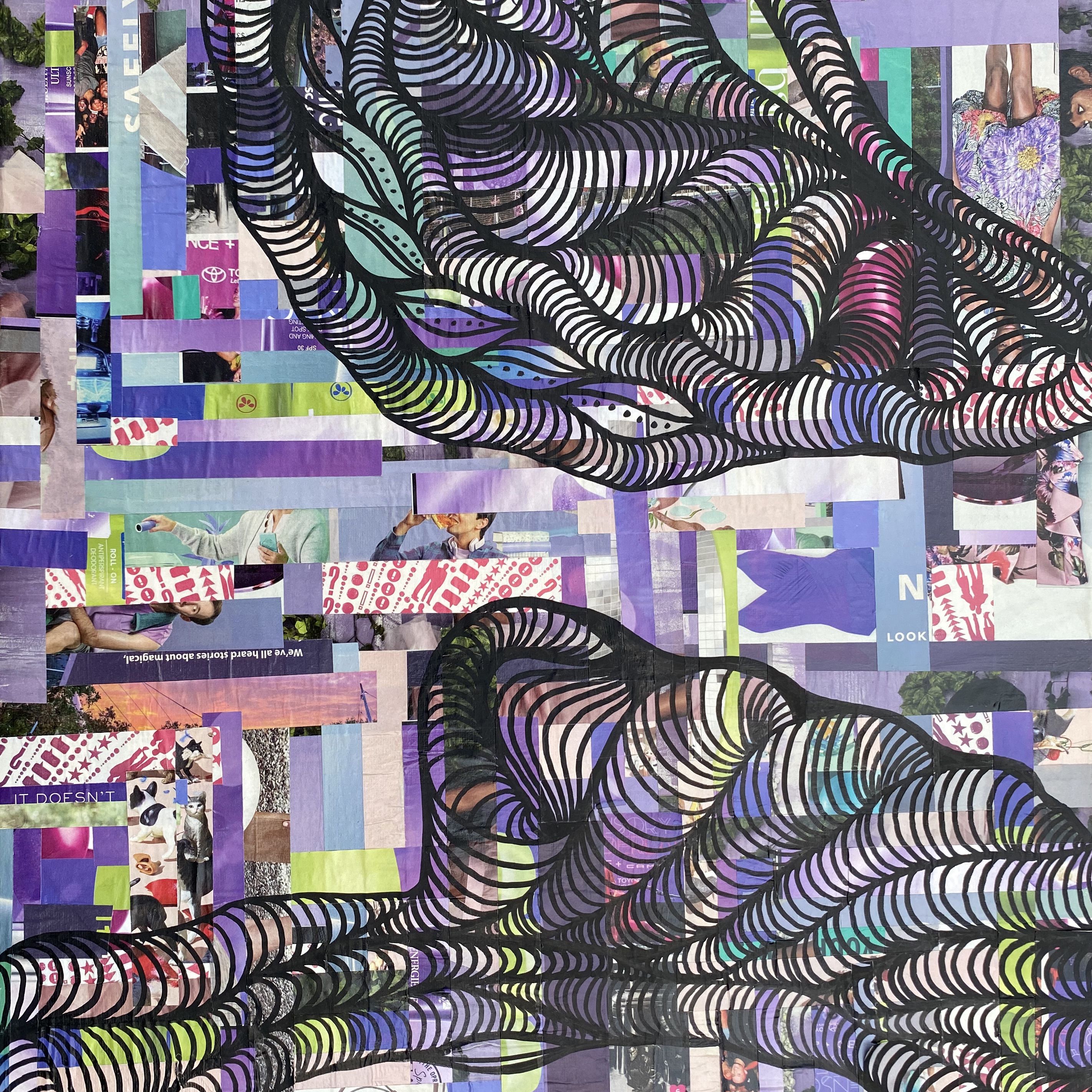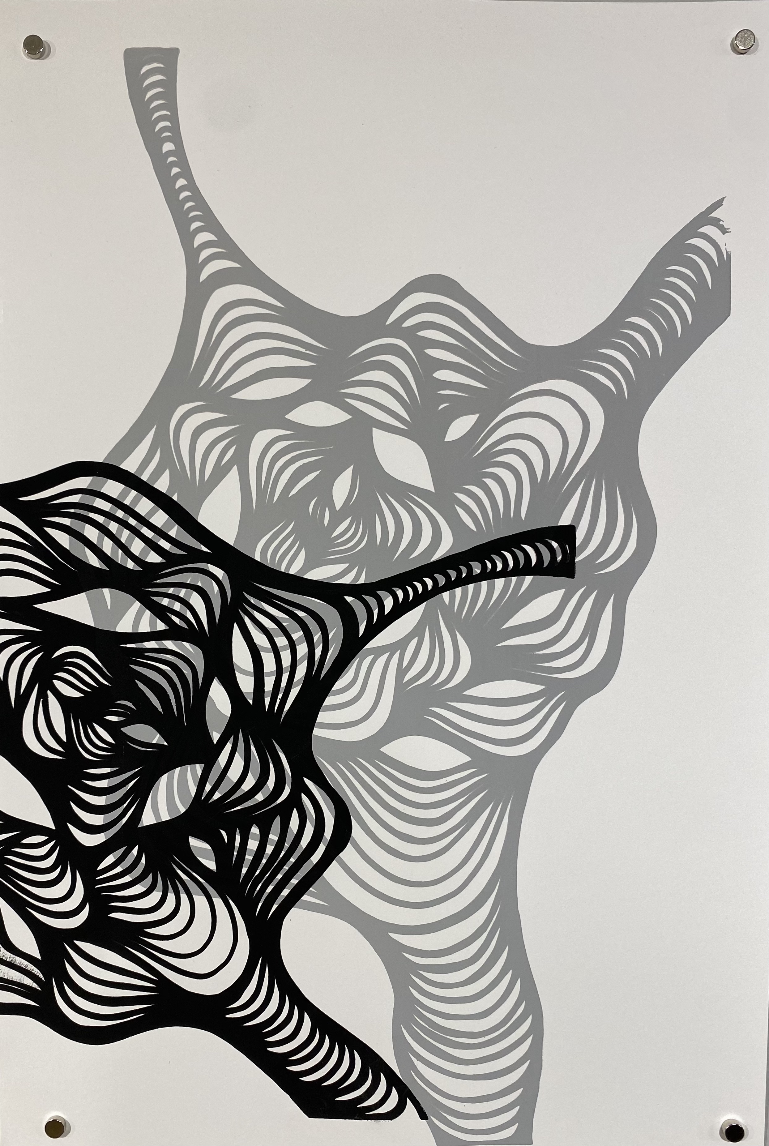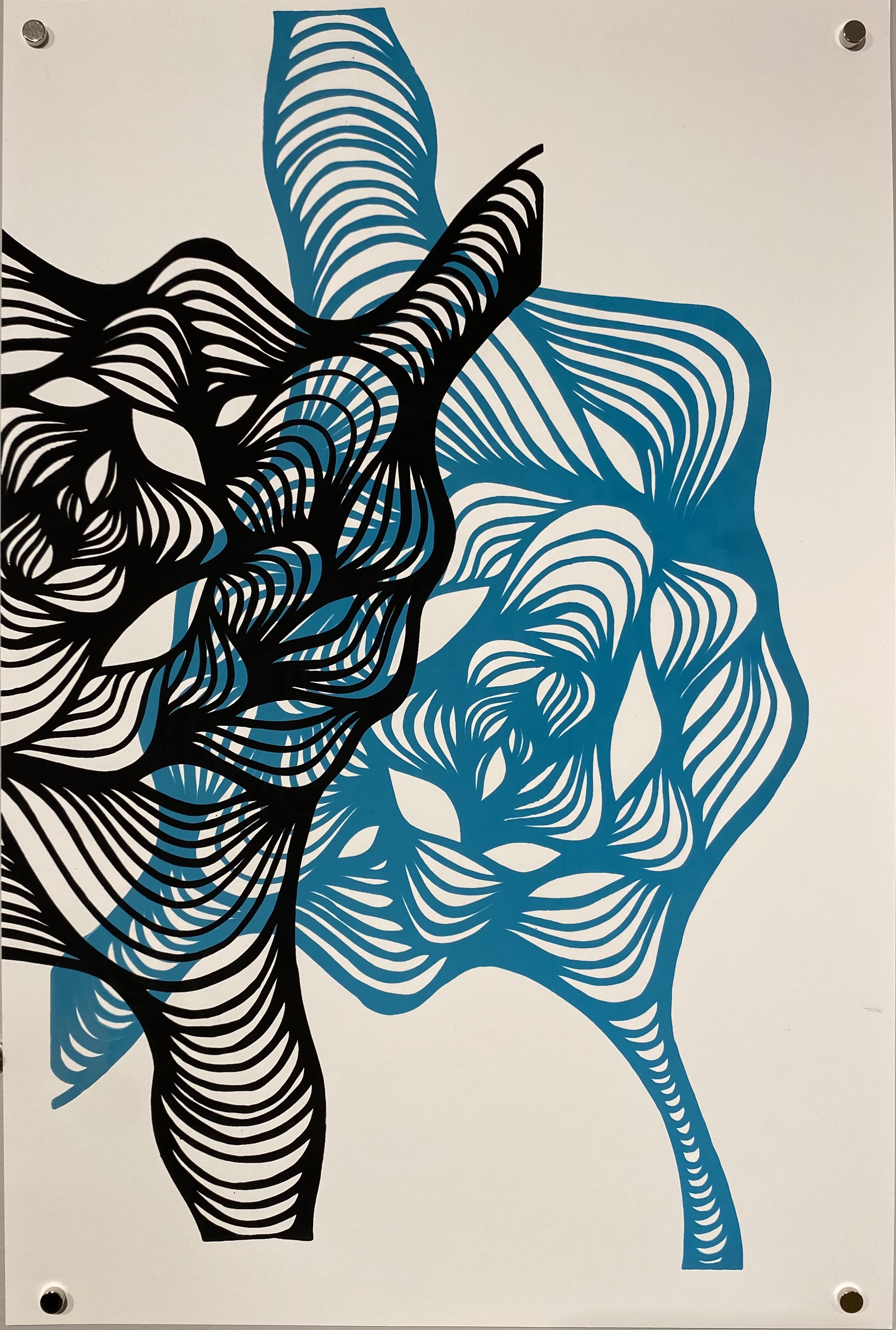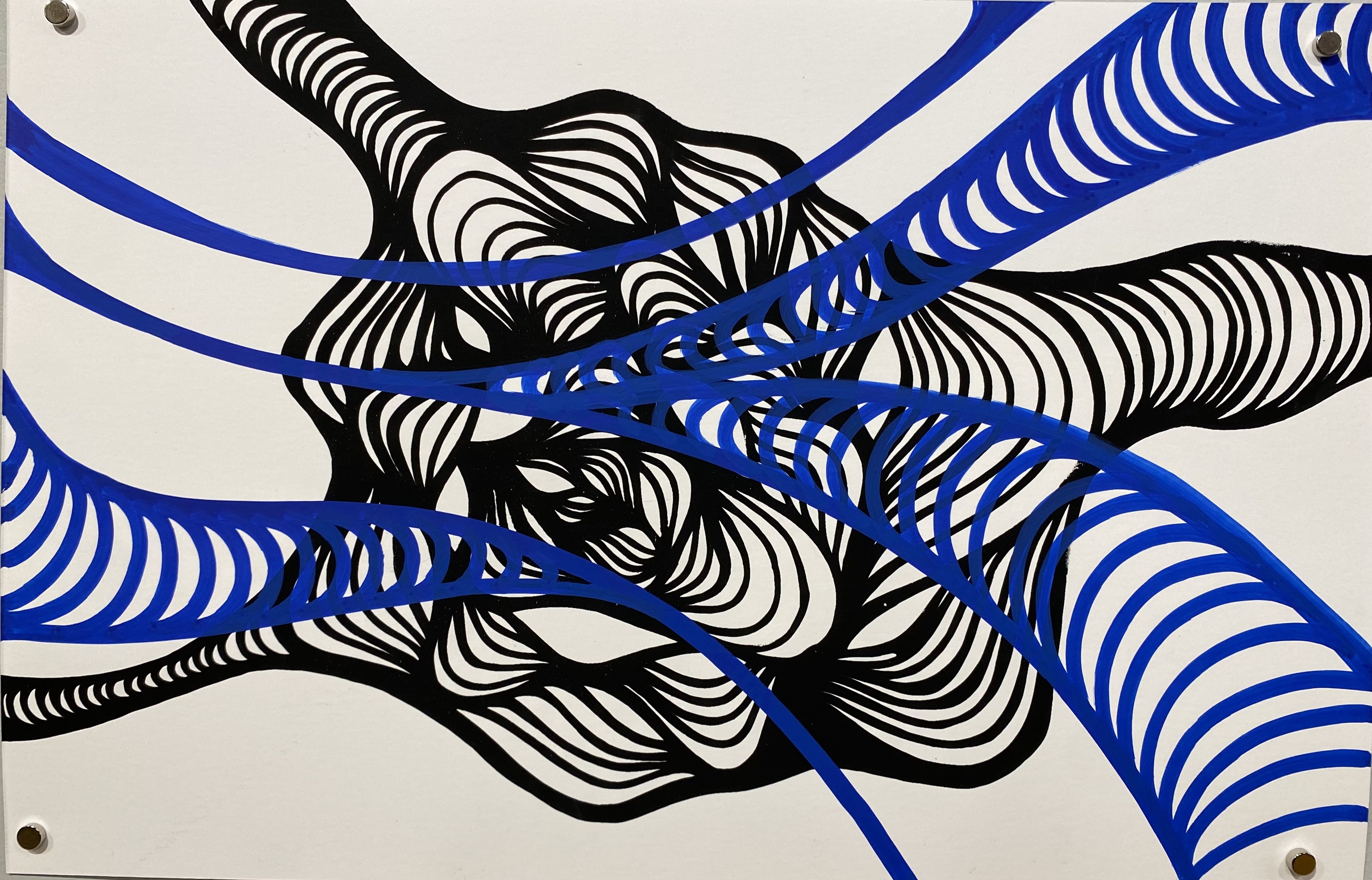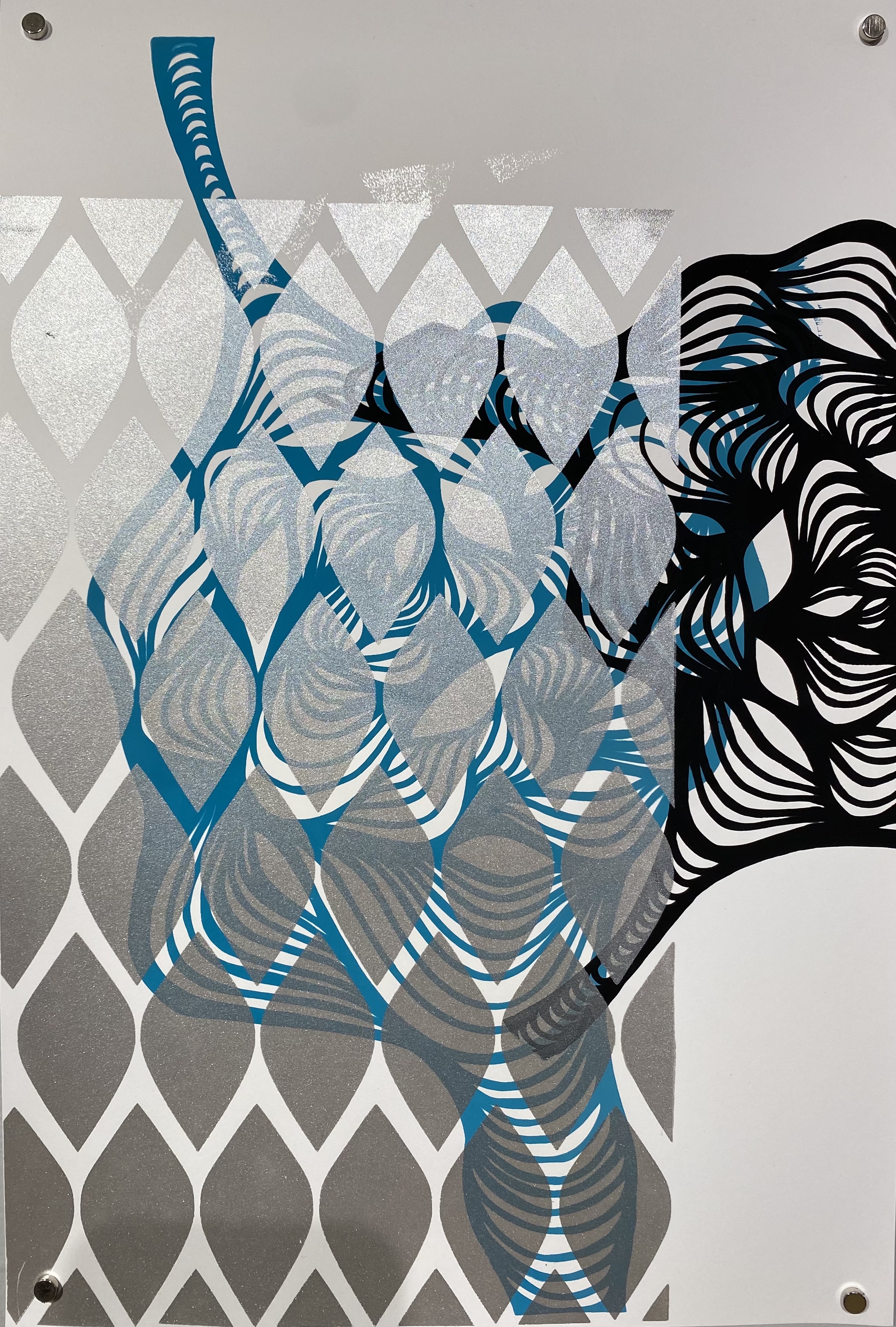My art practice involves leather jewelry design, 2D abstract artwork, and collage, incorporating the use of fluid lyrical lines with a meditative process and aesthetic. Each line intuitively flows, connecting and interacting with the next, with beautifully soft, feminine movement and contour. My jewelry work currently explores the repurposing of upcycled leather from high-end leather furniture scraps. My most sought-after jewelry is a line of earrings called “Fleathers,” as the designs are lightweight and carry a feather-like quality, although made with leather. My 2D abstract art explores the relationship between positive and negative spaces created by the weaving nature of my free-flowing linework, generally in black and white, while my jewelry employs the use of bright and bold colors.